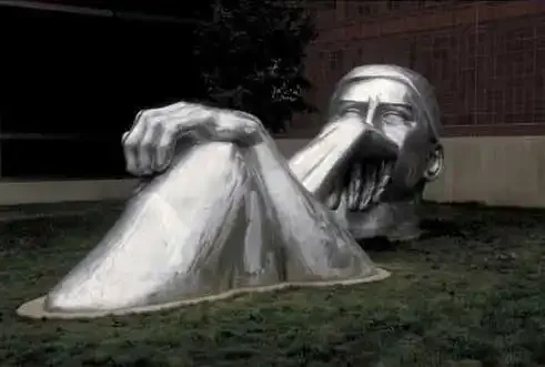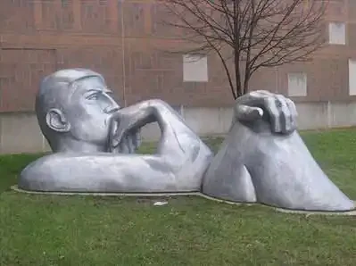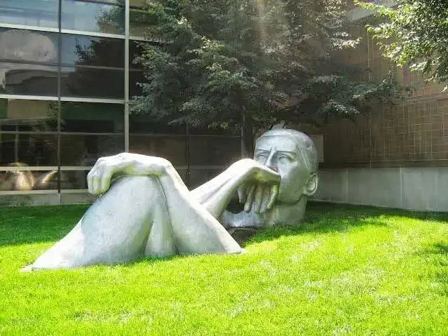Cast aluminum figure inspired by Rodin’s ‘Thinker’. This piece, as well as the two other Rodin inspired sculptures on BGSU campus, speak to the reflection and thoughts of BGSU students. 1996 – Olscamp Hall – Bowling Green,Ohio